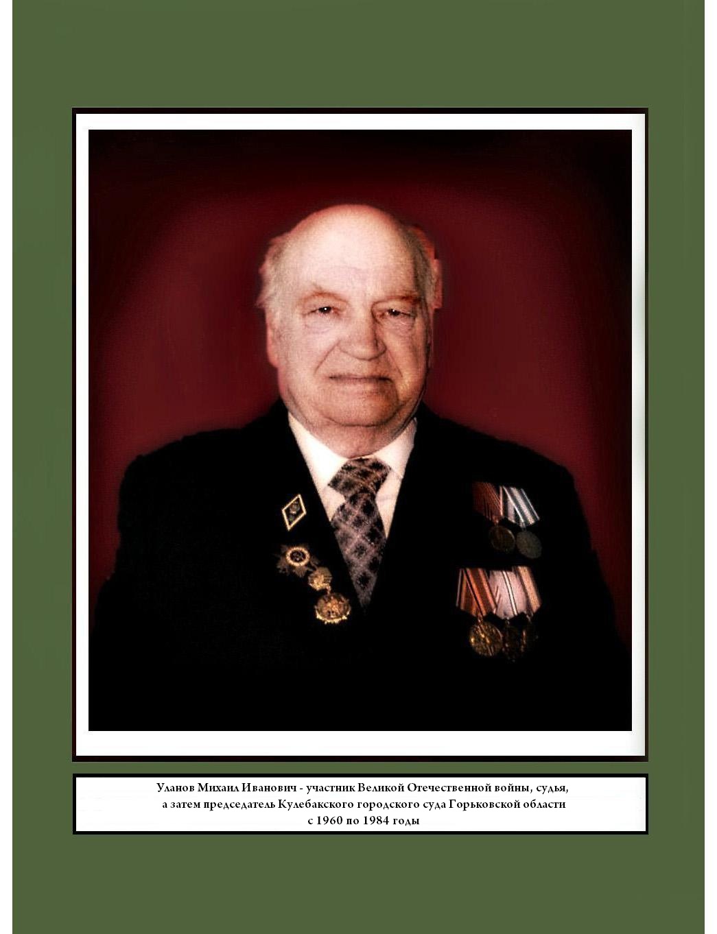 Уланов Михаил Иванович в июне 1941 года окончил Лукояновское педагогическое училище. 23 июня 1941 года призван в ряды Красной армии и был направлен на Кавказ. В 1942 году он был принят в ряды ВКП(б). В годы войны Михаил Иванович был морским пехотинцем, воевал во взводе разведки на Черноморском побережье СССР. Участвовал в обороне Новороссийска и Малой Земли. В 1944 году десатом высадились в Румынию, освобождали Сулин и Констанцу. В декабре 1944 года направлен в Ленинградскую высшую военно-морскую школу контрразведки. По окончании учебы Михаил Иванович был откомандирован на Сахалин. 24 декабря 1960 года решением бюро горкома КПСС и исполкома горсовета Уланов Михаил Иванович назначен первым председателем Кулебакского городского народного суда Горьковской области, проработавший в данной должности до апреля 1984 года. Награжден орденом Отечественной войны 2 степени, медалью «За оборону Кавказа», медалью Нахимова, медалью «За победу над Германией в Великой Отечественной войне 1941-1945 г.г.».